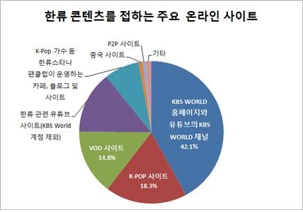 온라인 사이트 분야에선 KBS World의 홈페이지(kbsworld.co.kr)와 유튜브의 KBS World 채널(youtube.com/kbsworld)이 42.1%로, Soompi나 Allkpop 등의 유명 K-Pop 사이트 18.3%, hulu나 viki등의 VOD 사이트 14.8%보다 우위를 점했다. 위의 조사 결과로 KBS World가 한류의 대표 채널로 자리를 굳혀가고 있음이 확인됐다. -