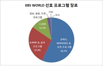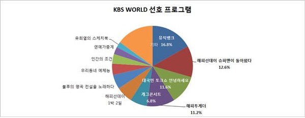 한편, 해외 시청자들이 가장 좋아하는 프로그램으로는 <뮤직뱅크>가 16.8%, <슈퍼맨이 돌아왔다> 12.6%, <대국민 토크쇼 안녕하세요> 11.6%, <해피투게더> 11.2%로 조사됐다. 이는 지난해 설문조사 <뮤직뱅크> 24.5%, <1박 2일> 9.3%, <개그콘서트> 9.2%, <아이리스2> 9.0%와 달라진 결과로, 전반적인 예능 버라이어티 프로그램의 강세라는 이유로 풀이된다. 설문조사를 담당한 KBS방송문화연구소 최선욱 박사는 “한류가 K-pop 위주에서 버라이어티 등 다른 장르로 확산되는 추세라 볼 수 있다”고 해석했다.
