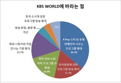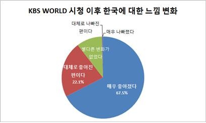KBS World를 시청한 후 한국에 대한 느낌의 변화를 묻는 질문에 매우 좋아졌다는 67.4%, 대체로 좋아졌다는 22.1%로 89.5%가 긍정적인 답변을 했다. KBS World가 한국의 이미지를 개선하는 민간 외교의 역할을 톡톡히 하고 있다는 결과다. 아울러 KBS World에 바라는 점에 대해서도 ‘연예 오락 프로그램의 확대’라는 답변이 지난해 62.5%에서 올해 36.2%로 크게 줄어든 대신, 한국 문화에 대한 프로그램 확대(17.1%), 자막 언어 수의 확대(16.8%), 해외 공연, 해외 시청자 참여 기획 확대(15.7%)의 요구가 증가했다.