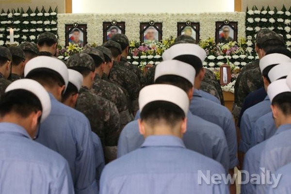 25일 오후 22사단 GOP(일반전초) 총기난사 사건으로 숨진 장병들이 안치된 경기도 성남시 국군수도병원 내 합동분양소에 군 장병들이 조문을 하고 있다.