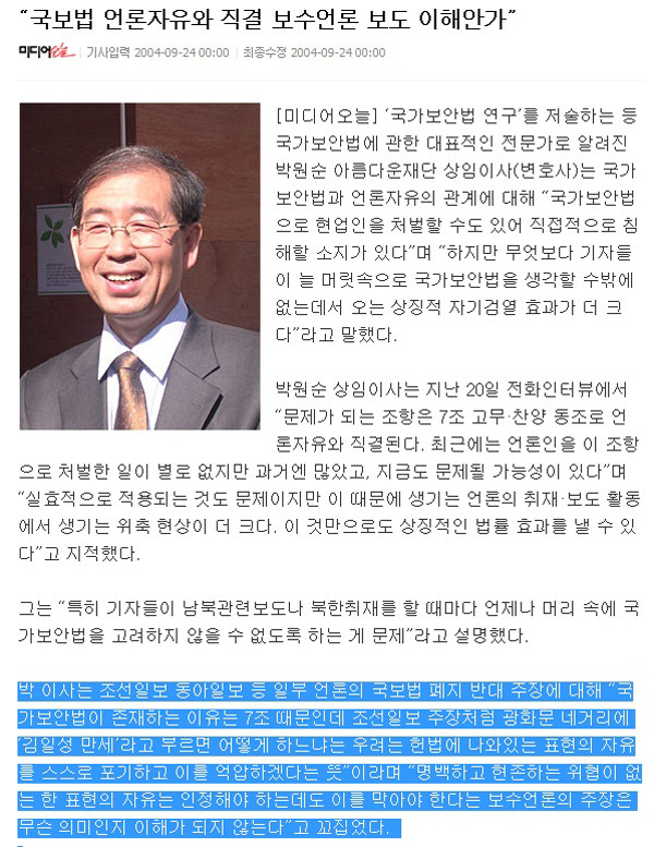 박원순 변호사는 2004년 9월24일 <미디어오늘>과의 인터뷰에서 보수 언론의 국보법 폐지 반대 주장에 대해 다음과 같이 답변했었다. -