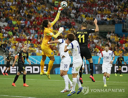 한국 축구대표팀 골키퍼 김승규(울산 현대) 1경기 7세이브를 기록하며 2014 브라질 월드컵 성공률 톱10에 들었다대한한국 축구 대표팀은 27일 새벽 5시(이하 한국시간) 브라질 상파울루 아레나 데 상파울루에서 열린 2014 브라질 월드컵 H조 예선 벨기에와의 경기에서 0-1로 패하며 16강 진출에 실패했다.후반 32분 얀 베르통언에 통한의 결승골을 허용하며 0-1로 패한 우리나라는 조별리그에서 1무 2패로 H조 꼴찌로 브라질 월드컵을 마감하게 됐다.16강 진출에는 실패했지만 김승규의 활약은 눈부셨다. 이날 국제축구연맹(FIFA)은 김승규가 세이브 성공률 9위에 올랐다 밝혔다.처음으로 월드컵 무대를 밟은 김승규는 1골을 내주긴 했지만 7번의 세이브를 기록하며 무려 87.5%의 높은 성공률을 보였다. 이는 세이브를 경기당 평균으로 환산하면 김승규가 1위이기도 하다.반면에 러시아와 알제리전에 나온 정성룡은 두 경기에서 5차례의 세이브를 나타냈으며, 성공률은 50%로 김승규보다 낮다.김승규 1경기 7세이브 소식을 접한 네티즌들은 "김승규 1경기 7세이브 잘 막았다", "김승규 이름 확실히 각인된 경기", "김승규 1경기 7세이브 한국의 거미손", "김승규 4년 후 월드컵이 기대된다", "김승규 1경기 7세이브 대단해" 등의 반응을 보였다.[김승규 1경기 7세이브, 사진=연합뉴스]