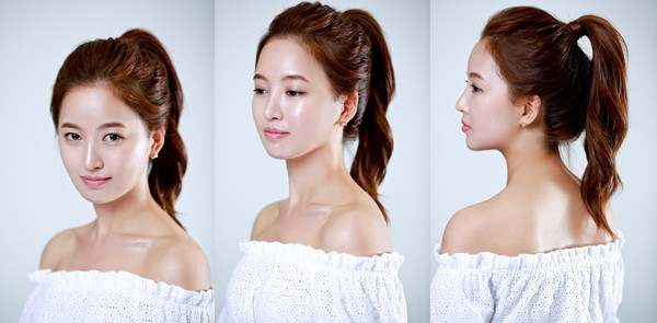 전체 머리카락을 상중하로 삼등분해서 아래 3분의 2를 잡아 목덜미 옆쪽으로 뺀다. 흘러내리는 잔머리는 그냥 둬도 좋지만, 잡은 머리카락은 고무줄을 여러 번 감아 고정한다.