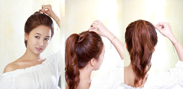 윗머리의 볼륨감을 유지하면서 윗머리와 아랫머리를 함께 묶는다. 머리 색깔과 같은 컬러의 고무줄을 사용한다. 아랫머리 중 몇 가닥을 잡아 고무줄을 감고, 핀으로 고정한다.▲ 영상으로 보기 http://www.youtube.com/watch?v=h3hFUwbNCOU[헤어 스타일리스트]▲ 아모스프로페셔널 크리에이티브 그룹 팀아모스 10기 [한스(헤어레스트 쉼)][헤어 스타일링에 사용된 제품]뿌리 볼륨을 살려 주는 헤어 미스트인 [아모스프로페셔널 볼륨 프라이머]와 에센스와 왁스가 함께 들어 있는 가벼운 탄력 웨이브 스타일링 에센스인 [아모스프로페셔널 컬링 에센스2X].