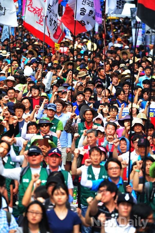 [민주노총] [전국농민회총연맹] 등 노동자, 농민단체와 시민단체 1만여 명이 28일 오후 [쌀 전면개방 반대, 민영화 저지, 노동기본권 쟁취 시국대회]를 열었다.이날 집회에서 민주노총과 전농 등은 [쌀 전면개방을 반대하고 FTA와 TPP협상 중단을 촉구하고 박근혜 대통령 퇴진]을 주장하며 7월 22일 동맹파업을 조직하겠다고 결의했다.시위대가 당초에 예정됐던 행진 코스인 을지로2가를 벗어나 도로를 불법 점거하자 올해 처음으로 경찰이 물대포로 해산을 시도했다.