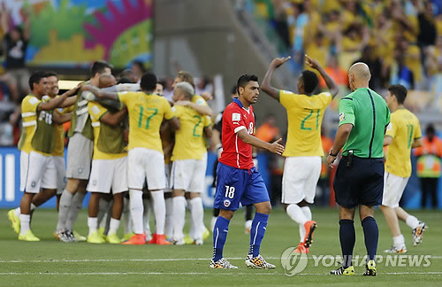 월드컵 개최국 브라질이 승부차기까지 가는 접전 끝에 칠레를 꺾고 가장 먼저 8강에 진출했다.브라질은 29일 오전 1시(이하 한국시간) 브라질 벨루오리존치의 미네이랑 경기장에서 열린 대회 16강전에서 연장전까지 120분을 1-1로 가르지 못하다가 승부차기에서 칠레를 3-2로 이겼다.브라질은 월드컵 16강에서 칠레를 세 번 만나 세 번 모두 승리하며 칠레의 천적임을 다시 한 번 입증시켰다.브라질은 전반 18분 루이스가 선제골을 넣어 승기를 잡은 듯 했으나 14분 만에 칠레 산체스에게 동점골을 내주며 경기는 원점으로 돌아갔다. 양 팀은 공격과 수비를 계속 주고받으며 팽팽한 균형을 후반까지 이어갔고, 승부를 가르지 못해 연장전에 돌입했지만 상황은 달라진 게 없었다.결국 승부차기에서 칠레는 마지막 키커인 하라의 킥이 골대를 맞고 나오며 브라질에게 분패했다. 특히, 브라질 골키퍼 줄리우 세자르(35, 토론토)는 칠레의 슈팅을 두 번이나 막아내며 결정적인 기여를 했다.한편, 브라질은 오는 7월 5일 콜롬비아와 대결한다.[브라질 8강 진출, 사진=연합뉴스]