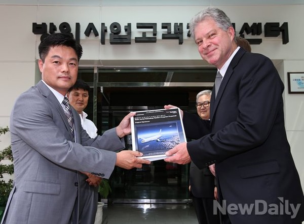 방위사업청은 30일 오후 서울 용산구 청사 행정안내실에서 KC-X(공중 급유기 도입사업) 기종 제안서를 제출받았다. 제안서 마감 결과 에어버스. 보잉, IAI 등 3개사가 제안서 제출을 했다. 이날 보잉사가 방위사업청 지원기훈련기사업팀장 김시철 공군 대령에게 제안서를 전달하고 있다.