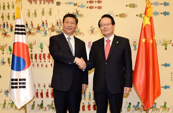 [시진핑] 중국 국가주석이 4일 오전 서울 여의도 국회의사당 국회접견실에서 [정의화] 국회의장을 접견하고 양국 간 경제협력 강화와 교류협력 증진방안 등 공동 관심사에 대해 의견을 나누고 있다.