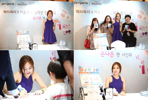 러블리한 코스메틱 브랜드 <페리페라>는 지난 7일 클럽 클리오 이대점에서 겨울왕국 컬렉션 론칭을 기념해 전속모델 에이핑크 <손나은>과 함께하는 [겨울왕국 팬 사인회]를 진행했다.오후 3시 클리오 이대점에서 진행된 사인회에서 손나은이 겨울왕국의 캐릭터 엘사 콘셉트로 등장, 페리페라 겨울왕국 컬렉션을 더욱 친근하게 소개하며 팬들과 기자들의 뜨거운 환호를 받았다.
