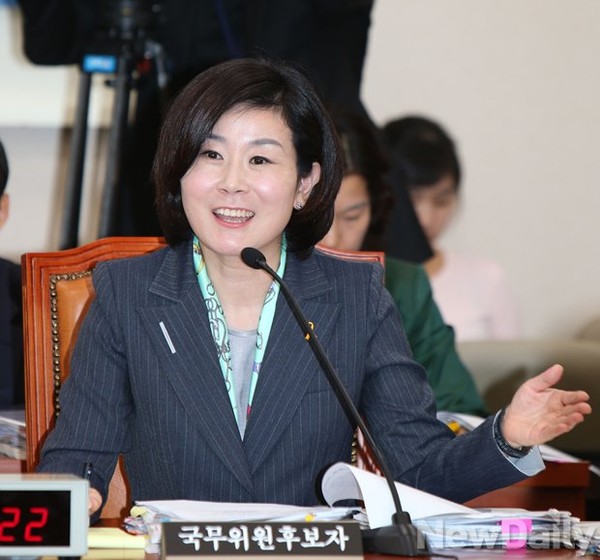 [김희정] 여성가족부 장관 후보자가 8일 오후 여의도 국회에서 열린 인사청문회에서 의원들의 질의에 답하고 있다