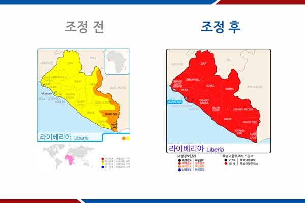 해당 지역에 있는 국민에게는 즉각 철수하라고 경고했다.기존의 여행경보 단계가 없었던 시에라리온도 마찬가지로 여행을 취소할 것을 권고했다.