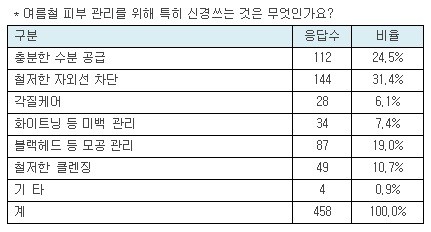 직장여성들이 여름철 피부 관리를 위해 가장 신경 쓰는 것은 [철저한 자외선 차단(31.4%)]인 것으로 나타났다.
