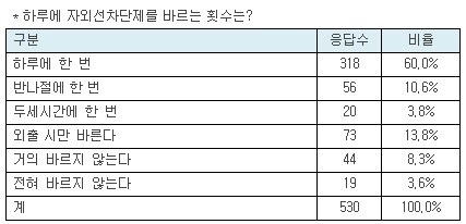 과반수의 직장여성은 [하루에 한 번(60.0%)만 바른다]고 답했으며, [외출 시만(13.8%)] [반나절에 한 번(10.6%)] [거의 바르지 않는다(8.3%)] [전혀 바르지 않는다(3.6%)]고 응답했다.직장여성이 대부분의 시간을 보내는 사무실(실내)에서는 관리가 더 소홀했다.10명 중 7명인 69.8%가 [실내에서는 자외선차단제를 바르지 않는다]고 답한 것.[평소 자외선 차단을 잘하고 있다고 생각하느냐]는 질문에는 [못하거나(46.8)] [매우 못하는 편(8.5%)] [잘하거나(42.8%)] [매우 잘하는 편(1.9%)]으로 나타나 신경은 쓰이지만 관리는 소홀한 것으로 나타났다.실제로 평소 자외선차단제를 잘 바르냐는 질문에도 68.7%만이 [그렇다]고 답했다.이처럼 여성들은 여름철 자외선 차단의 중요성은 인식하고 있지만 [잘 바르지 않게 되는 이유]도 다양했다.