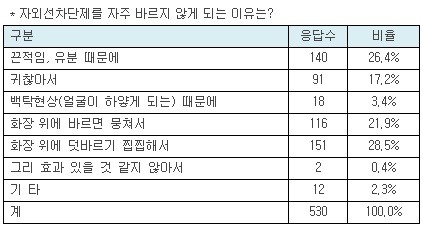 이 외에도 [끈적임, 유분 때문에(26.4%)] [귀찮아서(17.2%)] [백탁현상 때문에(3.4%)] [그리 효과가 있을 것 같지 않아서(0.4%)]라고 답했다.