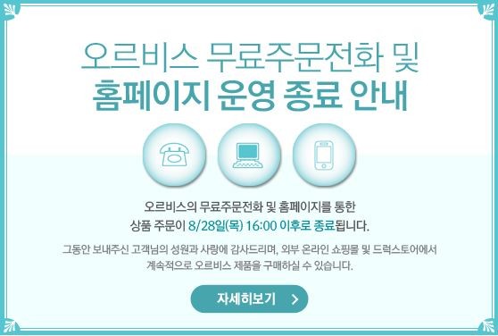 <오르비스>가 자사의 강점이었던 [무료주문전화 서비스]와 함께 공식 홈페이지 및 모바일을 통한 판매를 종료한다.동시에 오는 8월 28일 오후 4시 이후로 VIP 혜택과 샘플 증정을 비롯한 각종 서비스 제도와 쿠폰 운영 역시 중단되며, 서울 명동에 위치한 오르비스 전용 오프라인 매장은 7월 31일 22시까지 운영된 후 폐점된다.