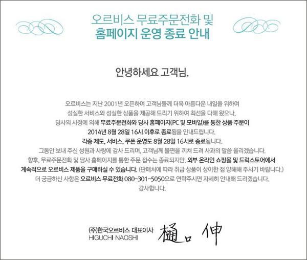 오르비스는 지난 6월 26일 공식 홈페이지를 통해 무료주문전화 및 홈페이지 운영 종료 사실을 고객들에게 알렸다.