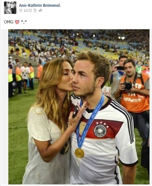 모델 앤 캐스린 비다(24)가 남자친구인 마리오 괴체(22)에 대한 애정을 과시했다.앤 캐스린 비다는 14일(이하 한국시간) 자신의 페이스북에 "OMG"라는 짤막한 글과 함께 사진 한 장을 올렸다.공개된 사진 속에는 앤 캐스린 비다가 금메달을 목에 건 괴체의 볼에 달콤한 볼뽀뽀로 2014 브라질 월드컵의 우승을 축하했다.괴체는 이날 브라질 리우데자네이루의 마라카낭 주경기장에서 열린 아르헨티나와의 대회 결승전에서 연장 후반 8분 극적인 결승골을 터뜨리며 독일을 우승으로 이끌었다.이로써 독일은 24년 만에 4번째 월드컵 우승컵을 들어올렸으며, 미주 대륙에서 열린 월드컵 대회에서 사상 최초로 우승한 유럽 국가가 됐다.한편, 스페인 이비자 출신인 앤 캐스린 비다는 독일 최고의 섹시모델 겸 가수로 볼륨감 넘치는 몸매를 자랑하며 속옷, 수영복 등의 모델로 활발히 활동 중이다.[괴체 여자친구, 사진=앤 캐스린 비다 페이스북]