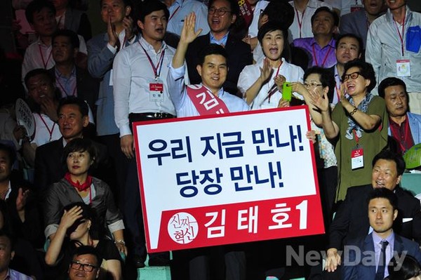 새누리당이 [김태호] 당대표 및 최고위원 후보가 14일 오후 서울 잠실 실내체육관 [새누리당 제 3차 전당대회]장에서 피켓을 들고 지지자들과 한 표를 호소하고 있다.