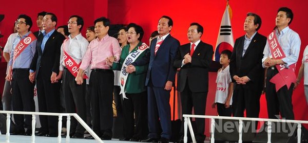 새누리당 당대표 및 최고위원 후보들이 14일 오후 서울 잠실 실내체육관 [새누리당 제 3차 전당대회]장에서 함께 노래를 부르고 있다.