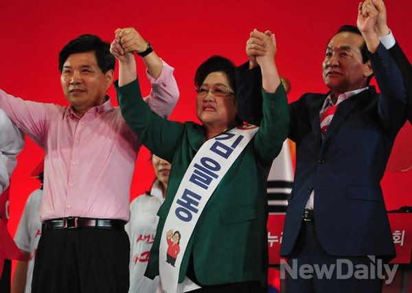 새누리당 당대표 및 최고위원 후보들이(왼쪽부터 홍문종-김을동-박창달) 14일 오후 서울 잠실 실내체육관 [새누리당 제 3차 전당대회]장에서 함께 당원들에게 인사하고 있다.