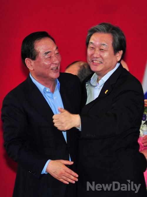 새누리당 새 대표로 선출된 [김무성] 의원이 14일 오후 서울 잠실 실내 체육관에서 열린 제 3차 전당대회에서 2위를 차지한 서청원 의원과 포옹을 하고 있다.김무성 신임 대표는 5만2706표를 얻어 1위를 차지 하였고 서청원 의원이 3만8293표로 그 뒤를 이었다. 이어 김태호(2만5330표), 이인제(2만782표), 홍문종(1만6629표), 김을동(1만4590표), 김상민(3535표), 박창달(3293표), 김영우(3067표) 순으로 집계됐다.김무성 의원은 부산 출생으로 [부산 경남중], [서울 중동고]를 거쳐 [한양대 경영학과]를 졸업했다. 이후 동해제강 상무와 삼동산업 대표이사를 거쳐 김영삼 전 대통령의 상도동계로 본격적으로 정치에 입문했다이후 문민정부에서 청와대 민정수석비서관, 내무부 차관 등을 역임했다.18대 총선 무소속으로 출마해 당선 됐으며 이명박 정부에서 원내대표를 여김 했다.19대 총선에서 공천을 받지 못했다가 지난 2013년 4.24 재보선에 출마해 의원직에 당선됐다.