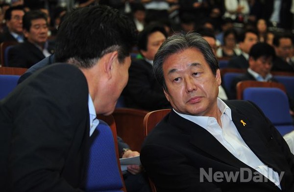 [김무성] 새누리당 신임 당대표가 15일 오후 여의도 국회에서 열린 새누리당 의원총회에 참석해 김태호 최고위원과 대화를 나누고 있다.