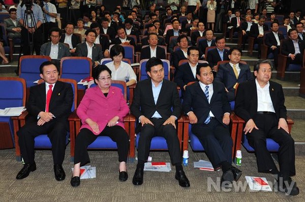 [김무성] 새누리당 신임 당대표가 15일 오후 여의도 국회에서 열린 새누리당 의원총회에 참석해 의원들의 모두발언을 듣고 있다.