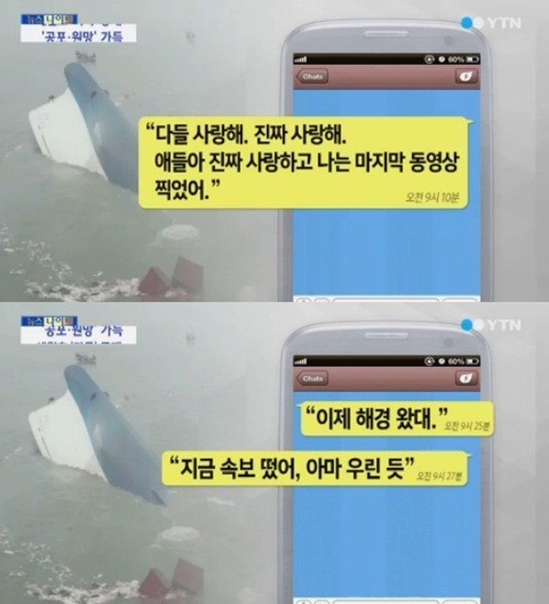 "연극부 사랑함. 다들 사랑해. 진짜 사랑해. 애들아 진짜 사랑하고 나는 마지막 동영상 찍었어"(오전 9시 10분 마지막 메시지 발송), "저 지금 방안에 살아있어요. 지금 구조중인데 저희 학교 학생 말고 다른 승객들부터 구하나봐요"(오전 10시 7분), "너무 무서워. 캐비닛이 떨어져서 옆방 애들이 깔렸어. 무서워"(오전 10시 12분) 등 구조를 애타게 기다리는 내용이 담겨있다.