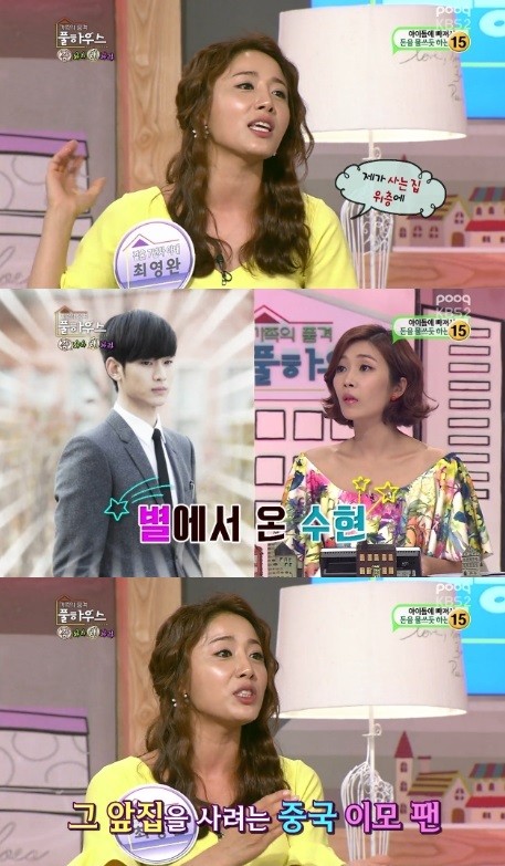 이날 최영완은 최근 연예인을 극성적으로 쫓아다니는 팬문화를 언급하던 중 "위층에 김수현씨가 산다"라고 말해 눈길을 모았다.놀란 출연진들이 "김수현과 같은 평수에 산다는 얘기냐"고 묻자 최영완은 "그렇다. 같은 라인 위층이다"라고 답했다.