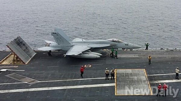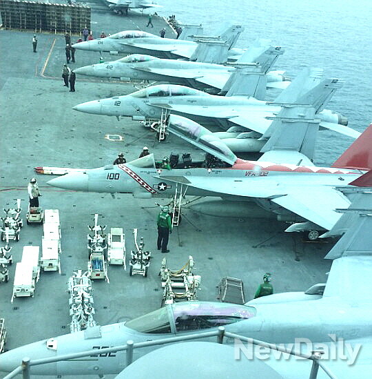 ▲항공모함 비행갑판에서 이륙직전의 F-18 E 슈퍼호넷.