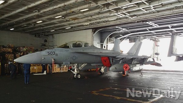 ▲격납고에서 출격을 기다리는 F-18 F 슈퍼호넷.