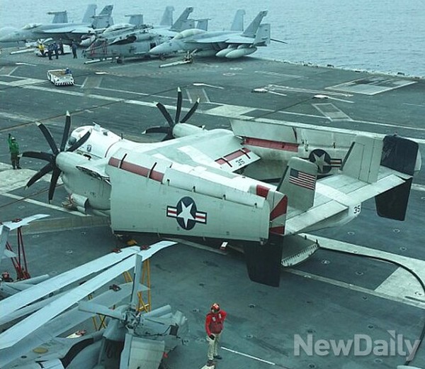 ▲탑승 대기하고 있는 C-2 그레이하운드 수송기. 항공모함내 유일하게 수송만 전담하는 항공기.