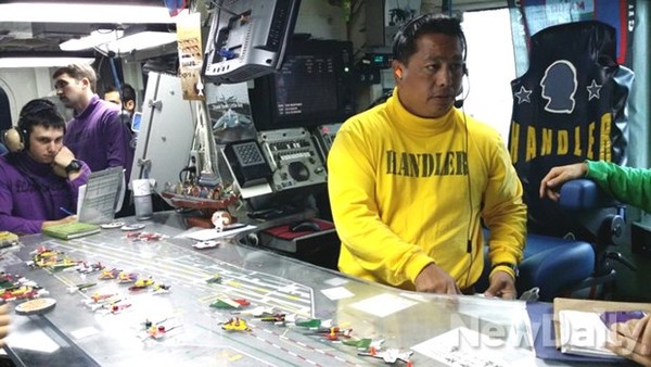▲비행갑판내 항공기 상황을 관리하는 미해군 장교.