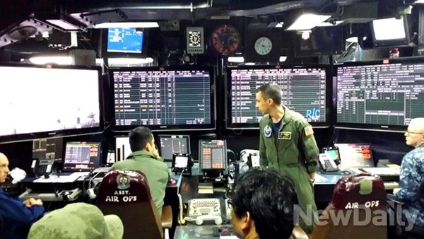 ▲항공모함내 이착륙 상항을 관리하는 항공관제실.