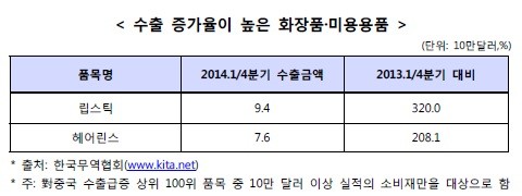 이민호·박신혜 주연의 <상속자들>, 전지현·김수현 주연의 <별에서 온 그대(별그대)> 등 중국 내 한국 드라마가 연이어 히트하면서 한국산 뷰티, 패션 아이템도 큰 인기를 얻고 있는 것으로 나타났다.한국무역협회 북경지부가 발표한 <중국 내 한류 효과와 소비재 수출 동향>에 따르면, 올 1/4분기 내 중국 수출품목 중 [전년 동기 대비 수출이 급증한 상위 100위 품목]에 의류(모피), 화장품(립스틱, 헤어 린스)도 포함됐다.지난해 우리나라의 화장품 수출대상국 1위였던 중국은 <별그대> 속 주인공 전지현이 바른 립스틱이 인기를 끌면서 올해 1/4분기 립스틱의 중국 수출이 전년 동기 대비 320% 증가한 것으로 나타났다.특히 중국 여성들은 드라마 속 한국 여성들의 피부가 좋은 것은 좋은 화장품을 썼기 때문이라고 생각하는 경향이 있어 한국산에 대한 수요가 지속적으로 증가하고 있다고 분석했다.