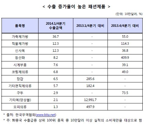 그동안 많지 않았던 의류수출도 크게 증가하고 있는 것으로 나타났다.품목별로는 [앙상블]의 수출이 전년 동기 대비 약 131배 폭증했고, 모피 의류는 전년 동기 대비 약 6배, 등산화는 전 분기 대비 약 5배 각 증가했다.특히 김수현이 모델인 남성복 <지오지아>의 경우 드라마 <별그대>에서 제품이 노출된 이후 중국내 인지도가 급상승, 그가 입었던 싱글버튼코트는 중국에서 완판을 기록했다.로만손의 주얼리 브랜드 <제이에스티나>도 송혜교, 지드래곤을 비롯 소녀시대, 다코타 패닝 등을 이용한 공격적인 스타마케팅을 지속해왔으며, 올해 중국 내 매출은 전년 대비 50~80% 성장할 것으로 내다보고 있다.한국무역협회 북경지부는 보고서를 통해 “앞으로도 한류를 활용한 다양한 마케팅 전략과 인터넷B2C, 홈쇼핑 모바일, 고급 백화점 진출 등 신 유통 채널을 적극 활용하고 고급 백화점 진출을 통한 이미지 제고도 필요하다”고 설명했다.[사진 = 한국무역협회, SBS 드라마 <별에서 온 그대> 캡처]