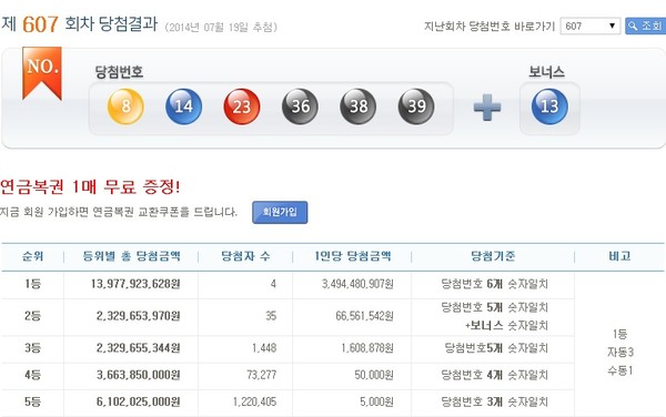 2014년 7월 19일 실시된 제607회 나눔로또 1등 당첨번호는 '8, 14, 23, 36, 38, 39'이며, 2등 보너스 번호는 13번이다.이번 로또 607회차 추첨 결과 1등 당첨자는 4명으로 34억9448만907원의 당첨금을 받게 됐다.1등 번호 중개와 보너스 번호를 맞힌 2등은 35명이며, 1인당 6656만1542원씩 지급받는다. 당첨번호 중 5개를 맞힌 3등은 1448명으로 당첨금은 각 160만8878원이다.5만원의 당첨금을 받는 4개의 번호를 맞힌 4등은 7만3277명이며, 5000원의 고정 당첨금을 받는 5등은 122만405명이 나온 것으로 집계됐다.한편, 이번주 로또607 총 판매금액은 568억621만3000원이다.[로또607회당첨번호, 사진=로또 홈페이지 캡처]