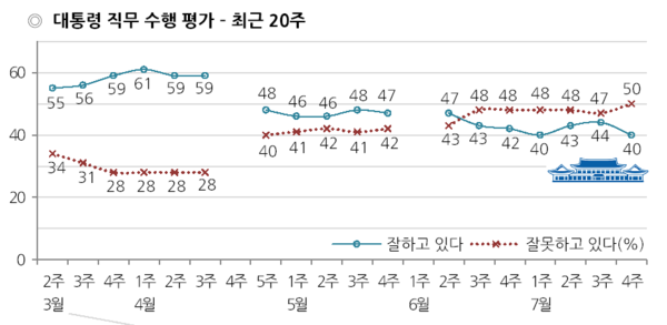 한국갤럽이 7월 넷째 주(22일부터 24일까지 3일간) 전국 성인 1천3명을 대상으로 조사한 결과에 따르면 박근혜 대통령의 국정수행지지율은 40%로 나타났다.