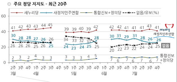 새정치민주연합은 26%로 직전 조사와 같은 수치였다.