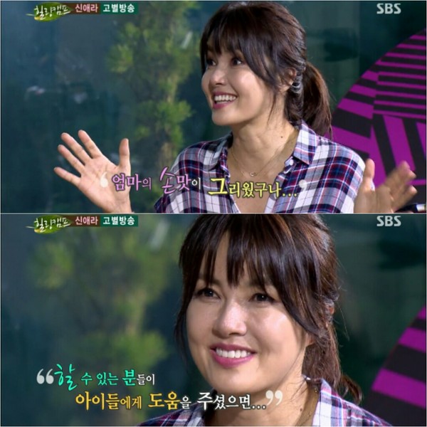 마지막으로 신애라는 "다니는 보육원이 있는데 그곳에서 TV에서 된장 찌개가 맛있게 끓는 것을 보고 아이들이 '맛있겠다'고 말하는 것은 나와 아이들이 맛있겠다 하는 것과는 차원이 다른 것 같다"고 얘기하며 "배가 고파서 맛있겠다고 하는 게 아니라 엄마가 차려준 뚝배기의 된장찌개와 손맛이 그리웠겠구나 생각하면서 정말 가슴이 아팠다"고 말했다.신애라는 끝으로 "그런 아이들이 가정의 따스함을 느낄 수 있도록 다같이 노력하면 좋지 않을까 한다"며 "할 수 있는 분들이 아이들에게 많은 도움을 주셨으면 좋겠다"는 당부도 잊지 않았다.