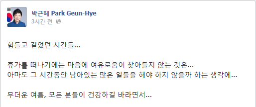 박 대통령은 이날 오전 페이스북에 "힘들고 길었던 시간들…"이라는 휴가 메시지를 올렸다.
