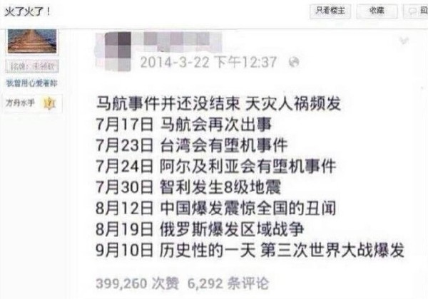 최근 각종 SNS에 확산되고 있는 이 게시글에는 ▲7월 17일 말레이시아 항공 사고 ▲7월 23일 대만 항공 사고 ▲7월 24일 알제리 항공 사고 ▲7월 30일에는 칠레에서 지진 ▲8월 12일에는 중국을 들썩일 스캔들 ▲8월 19일은 러시아 지역 전쟁 ▲9월 10일은 3차 대전이 발발한다는 내용이 적시돼 있다.
