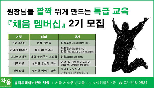 헤어짱 회원사만을 위한 위탁교육 전문 센터인 뷰티트레이닝센터 <채움>이 미용실 인력의 성장을 위한 종합 교육 프로그램인 <채움 멤버십>을 오픈, 1기 교육을 개강했다.미용실 인턴부터 경영자까지 직급별로 테마에 맞춰 다양하게 구성돼 있는 <채움 멤버십>은 개강 전부터 매장 매출 향상을 위한 교육 아이템으로 뜨거운 관심을 모은 바 있다.5개 과정으로 구성돼 있는 <채움 멤버십>은 △ 채움센터 인재육성 전문 강사진을 통해 철저한 베이식 교육이 이뤄지는 인턴과정(정명호/노지영) △ 디자이너 승급 대상자를 위한 승급 교육인 데뷔과정(권오성/정명호/노지영) △ 스타 디자이너를 통해 배우는 매출을 높여 주는 스타일(원옥) △ 매장 내 모든 CS를 마스터할 수 있는 관리자 CS 과정(이충한, 김은나) △ 현장 경영에 최적화된 경영전략 교육인 경영자과정(장석로) 등 직급별 테마로 교육이 구성돼 있다.<채움 멤버십> 교육은 1년 과정으로 구성되어 있으며, 멤버십 가입 매장 당 5명이 직급에 맞추어 교육을 신청할 수 있다.<채움> 측은 <채움멤버십> 1기 개강과 동시에 2기 교육생 모집을 진행, 8월 내 2기 교육을 개강한다는 방침으로 자세한 교육 과정 확인 및 신청서 다운로드는 헤어짱 블로그를 통해 가능하다.체계적인 교육 시스템이 필요한 중소형 미용실에 큰 호응을 얻고 있는 <채움멤버십>은 직급별로 맞춤형 테마 교육을 진행함으로써 경영자가 직원 교육 걱정 없이 경영에 전념할 수 있도록 지원 가능하여 미용실 교육의 판도를 바꿀 것으로 예상된다.[사진 = 채움]