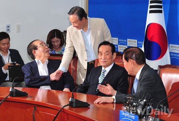 새정치민주연합 상임고문들이 1일 오전 여의도 국회 원내대표실에서 7.30재보선 참패에 대한 대책 논의를 위해 열린 비대위 구성 비상회의에서 인사하고 있다.