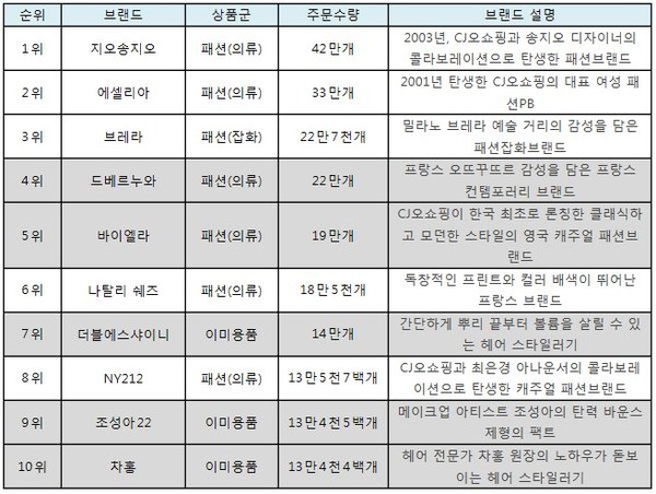 ▲ CJ오쇼핑, 신진 브랜드 더해져 패션 카테고리 강세CJ오쇼핑은 패션 브랜드 <지오송지오>부터 <드베르누와>, 뷰티 브랜드 <조성아22>, <차홍> 등 상반기 10대 히트 상품 전체를 패션·뷰티 카테고리가 석권했다.상반기 히트 상품 1위를 차지한 <지오송지오>, 2위 <에셀리아> 등 심플하고 베이식한 디자인의 패션 브랜드들이 작년에 이어 계속해서 강세를 보인 가운데, <드베르누와>, <바이엘라> 등 감성적이면서 실용성을 겸비한 디자인의 패션 브랜드도 새롭게 순위권 안에 진입했다.9위에 새로 진입한 조성아22, 간편하게 사용할 수 있는 헤어기기를 선보인 <더블에스샤이니>,<차홍> 등 2030 여성들에게 많은 사랑을 받은 뷰티 브랜드의 약진도 돋보였다.홈쇼핑 주요 고객층인 45~55세 여성이 상반기 전체 주문량 중 40%를 차지했으며, 남녀 성비로는 전체 주문량 중 여성이 86%, 남성이 14%의 비중을 보였다.특히 남성들은 캠핑 열풍에 발맞춘 아웃도어 브랜드에서 높은 주문률을 보인 반면 여성들은 화장품과 언더웨어, 의류 등 다양한 패션 및 뷰티상품에 지속적인 관심을 보였다.CJ오쇼핑 영업기획담당 황준호 부장은 “올해 상반기에도 패션 상품의 강세가 여전했지만 모던한 스타일과 셀프 미용의 유행으로 새로이 순위권에 진입한 브랜드들이 유독 많았다”며 “자신을 가꾸기 위한 투자를 아끼지 않는 쇼핑 트렌드가 앞으로도 지속될 것으로 보고 고객 니즈에 맞는 관련 상품을 발 빠르게 선보일 수 있도록 힘쓰겠다”고 덧붙였다.[GS샵 TV홈쇼핑 부문 2014년 상반기 히트상품(기간 2014 1/1~6/15 판매수량 기준)]