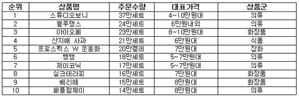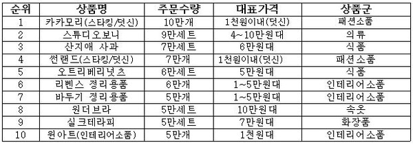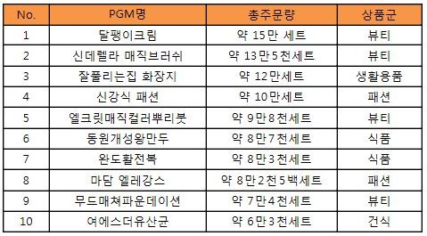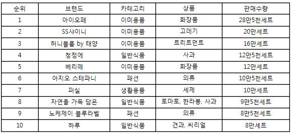 1위와 2위에는 <엘렌실라 달팽이크림>과 롱&업 마스카라 <신데렐라 매직브러쉬>가 자리해 뷰티상품의 강세를 보여줬고, 5위는 새치커버 브러시 <엘크릿매직컬러뿌리붓>, 4위와 8위는 패션브랜드 <신강식패션>과 <마담엘레강스>, 9위는 <무드매쳐파운데이션>이 차지했다.
