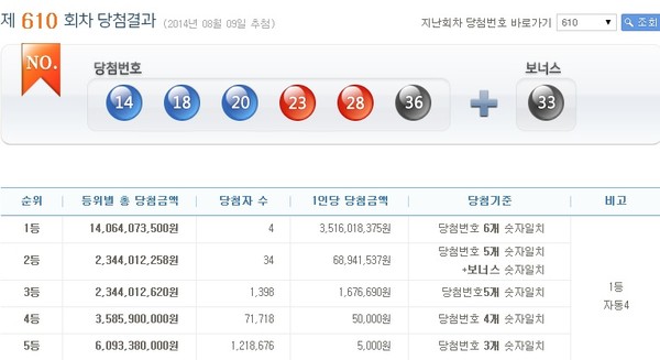 2014년 8월 9일 실시된 제610회 나눔로또 1등 당첨번호는 '14, 18, 20, 23, 28, 36'이며, 2등 보너스 번호는 33번이다.이번 로또 610회차 추첨 결과 1등 당첨자는 4명으로 35억1601만8375원의 당첨금을 받게 됐다.1등 번호 중개와 보너스 번호를 맞힌 2등은 34명이며, 1인당 6894만1537원씩 지급받는다. 당첨번호 중 5개를 맞힌 3등은 1398명으로 당첨금은 각 167만6690원이다.5만원의 당첨금을 받는 4개의 번호를 맞힌 4등은 7만1718명이며, 5000원의 고정 당첨금을 받는 5등은 121만8676명이 나온 것으로 집계됐다.한편, 이번주 로또610 총 판매금액은 568억6275만6000원이다.[로또610회당첨번호, 사진=로또 홈페이지 캡처]
