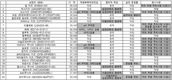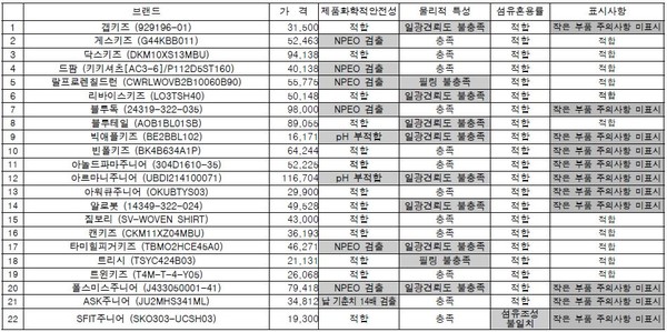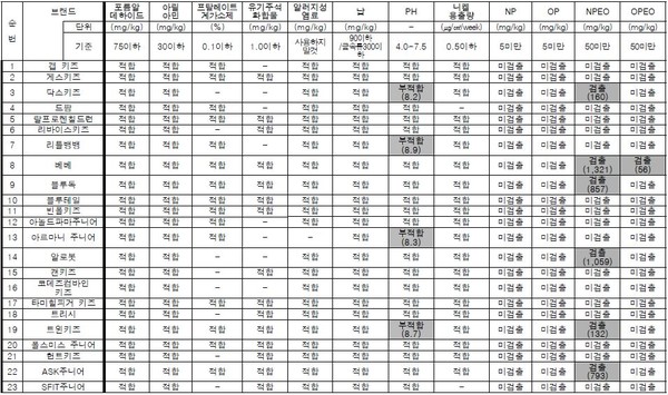 또 아동용 셔츠 제품 중에서는 <게스키즈>, <드팜>, <랄프로렌칠드런>, <블루독>, <타미힐피거키즈>, <폴스미스주니어> 6개 브랜드에서 NPEO가 검출된 상태다.이 중 <베베>는 1321mg/kg, <알로봇>은 1059mg/kg으로 유럽에서 유해성을 판단하기 위해 친환경 기준으로 통용되는 유럽섬유 환경인증기준(OEKO-TEX Standard 100) 기준치(250mg/kg)의 4배 이상이 검출됐다.뿐만 아니라 <ASK주니어>의 경우 NPEO 외에 안전 품질 표시기준의 납 기준치 90㎎/㎏의 14배 이상인 1285mg/kg의 납이 검출됐다.[아동용 셔츠 제품 화학적 안전성]
