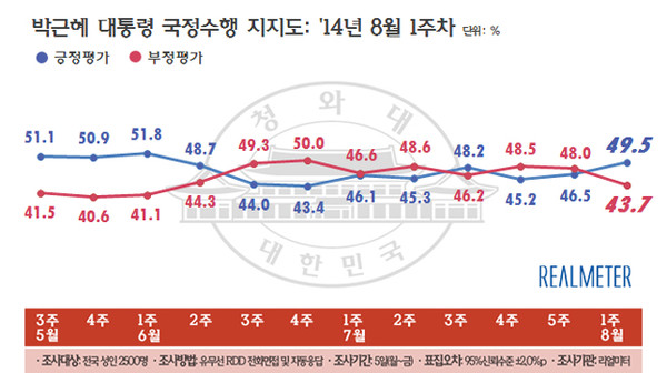 여론조사 전문기관 <리얼미터> 8월 첫째주 주간집계에서, 박 대통령의 국정수행 지지율은 전주 대비 3%p 상승한 49.5%를 기록, 2주 연속 상승했다.