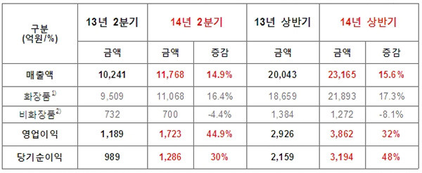 먼저 아모레퍼시픽은 매출 9667억 원으로 전년대비 21% 성장했고, 영업이익 역시 1511억 원으로 69% 성장한 것으로 집계됐다.올해 상반기 매출과 영업이익은 각각 15.6%, 32% 증가한 2조3165억 원, 3862억원에 달했다. 순이익은 48% 증가해 3194억원을 기록했다.주요 [화장품 계열사] 아모레퍼시픽의 2분기 실적은 유통 경쟁력 강화, 해외사업 성장 등에 힘입어 지난해 같은 기간보다 21% 증가한 9667억 원 매출을 기록했다.아모레퍼시픽 관계자는 “국내 화장품 사업은 면세, 디지털, 아리따움 등 주요 경로의 매출이 고성장하며 견고한 성장을 이뤄냈다”고 분석했다.[국내 화장품 사업]이 22.9% 성장한 6746억 원, 해외 화장품 사업은 28% 성장한 1904억 원, 매스 사업 및 설록 사업은 0.4% 증가한 1017억 원을 각각 기록했다.방판 채널은 채널 건전성 확보를 위한 재고 조정으로 매출이 감소했으나, 카운슬러 활동력 강화 등을 통해 질적 개선을 이뤄냈다.여전히 백화점 채널은 차별화된 브랜드 포트폴리오로 시장점유율 1위를 달성하며 시장에서의 리더십을 강화했다.특히 설화수, 헤라, 프리메라 등 대표 브랜드의 가치 제고 및 효율적인 매장관리 등을 통해 수익성을 개선했으며, 면세 채널은 중국 고객의 구매액 증가로 고성장했다.아리따움은 제품과 유통, 서비스의 경쟁력 강화로 견고한 성장세를 이어 나갔다.제품 카테고리를 다변화하고 매장 및 서비스 혁신을 통해 차별화된 구매경험을 제공했으며, VB 솔루션 론칭 등 지속적인 제품 혁신으로 경쟁력을 강화했다. 여기에 신규고객 유입이 지속되며 점당 매출 확대를 견인했다.디지털 경로는 판매 제품 유형(기초, 메이크업, 클렌징, 네일 등)의 확대로 다양한 고객 요구에 대응하고, 전용 브랜드 인지도 강화 및 다양한 신제품 출시로 홈쇼핑, e-커머스 등 전 경로에서 견고한 성장을 지속했다.[해외 화장품 사업]은 중국과 아세안 등 성장시장에서 사업이 확대됐다. 중국·아시아 등 성장시장에서 매출이 48.8% 성장한 1634억 원을 기록했다.중국 사업은 브랜드력 강화 및 채널 다각화로 수익성 개선을 동반한 매출 성장을 이뤄냈다.설화수는 기존점 성장 및 매장 확대로 매출이 고성장했으며, 라네즈는 히트상품 판매 확대로 백화점 및 e-커머스 경로에서 견고한 성장을 지속했다.또 계열사인 이니스프리는 신규 매장 오픈 및 디지털 커뮤니케이션 활동 강화로 신규 고객 유입이 증가하며 매출이 고성장했다.중국과 일본을 제외한 아시아 시장에서는 설화수, 라네즈의 히트상품 판매 확대와 이니스프리 성공적 론칭으로 고성장했으며, 백화점과 더불어 FSS 및 e-커머스 등 유통채널 다각화로 고객 접점을 확대한 것으로 분석된다.프랑스, 미국 등 성숙 시장의 경우도 6.3% 감소한 390억 원의 매출을 기록했다.미국 시장은 히트 상품 판매 증가로 백화점, 세포라 등 전 경로 고른 매출 성장을 보였으며, 라네즈 브랜드의 타깃 입점 및 세포라 캐나다 등 신규 지역 진출 확대로 유통 및 지역 포트폴리오를 다각화했다.프랑스 시장은 신제품(롤리타 렘피카 ELLE L’AIME)의 판매가 호조를 보였으나, 유럽 내수 침체에 따른 기존 제품의 판매 부진으로 매출이 감소했다.일본 시장은 소비세 인상 효과로 2분기 판매가 저조했으며, 에뛰드 상권 조정 등 질적 성장을 위한 유통 채널 정비로 매출이 감소했다는 것이 아모레퍼시픽 측의 설명이다.[매스 사업]은 내수 침체 영향 등으로 매출이 소폭 감소했다. 설록 사업은 오설록 브랜드 인지도를 강화하고 프리미엄 사업을 확대했으며, 려, 미쟝센, 해피바스 등의 경우는 양모, 염모 등 기능성 헤어케어 제품의 판매가 증가했다.계열사별 희비도 엇갈렸다. 지난해부터 매출 호조를 보이고 있는 이니스프리는 2분기 매출이 전년 동기 대비 38% 증가한 1158억 원, 영업이익은 63% 증가한 199억원을 기록했다.특히 이니스프리는 ▲그린티라인 ▲화산송이 ▲삼나무 등 주요 상품의 판매 호조가 매출을 끌어올렸으며, 해외 사업의 확대로 수출 관련 매출이 증가했다. 또 관광객 증가에 힘입어 면세 경로도 성장을 지속했다.반면 에뛰드는 2분기 매출이 12% 감소한 755억 원, 영업이익은 116% 감소해 12억원의 적자를 기록했다.아모레퍼시픽 측은 “해외 에이전트와의 거래 축소로 수출 매출이 감소했고 브랜드력 강화를 위한 마케팅 투자 확대로 이익이 감소했다”고 설명했다.최근 대표를 교체한 아모스프로페셔널은 양모, 염모, 세정 등 주요 상품군의 판매 호조 및 면세 채널의 고성장에 힘입어 매출이 전년대비 7% 상승한 132억 원을 기록했지만, 면세 비중 확대에 따른 유통수수료 증가로 수익성이 약화돼 영업이익은 31억원으로 전년대비 5% 감소했다.[비화장품 계열사]는 2분기 매출이 전년 동기 대비 4.4% 감소한 700억 원, 영업이익은 102.8% 감소해 1억원의 적자를 기록했다.회사 측은 “태평양제약은 제약사업 양도에 따라 매출 및 이익이 모두 감소했고, 퍼시픽글라스는 생산 시설 확대로 원가율이 소폭 증가하고 생산 공정 혁신을 위한 비용이 발생했다”고 말했다.[사진 = 아모레퍼시픽]